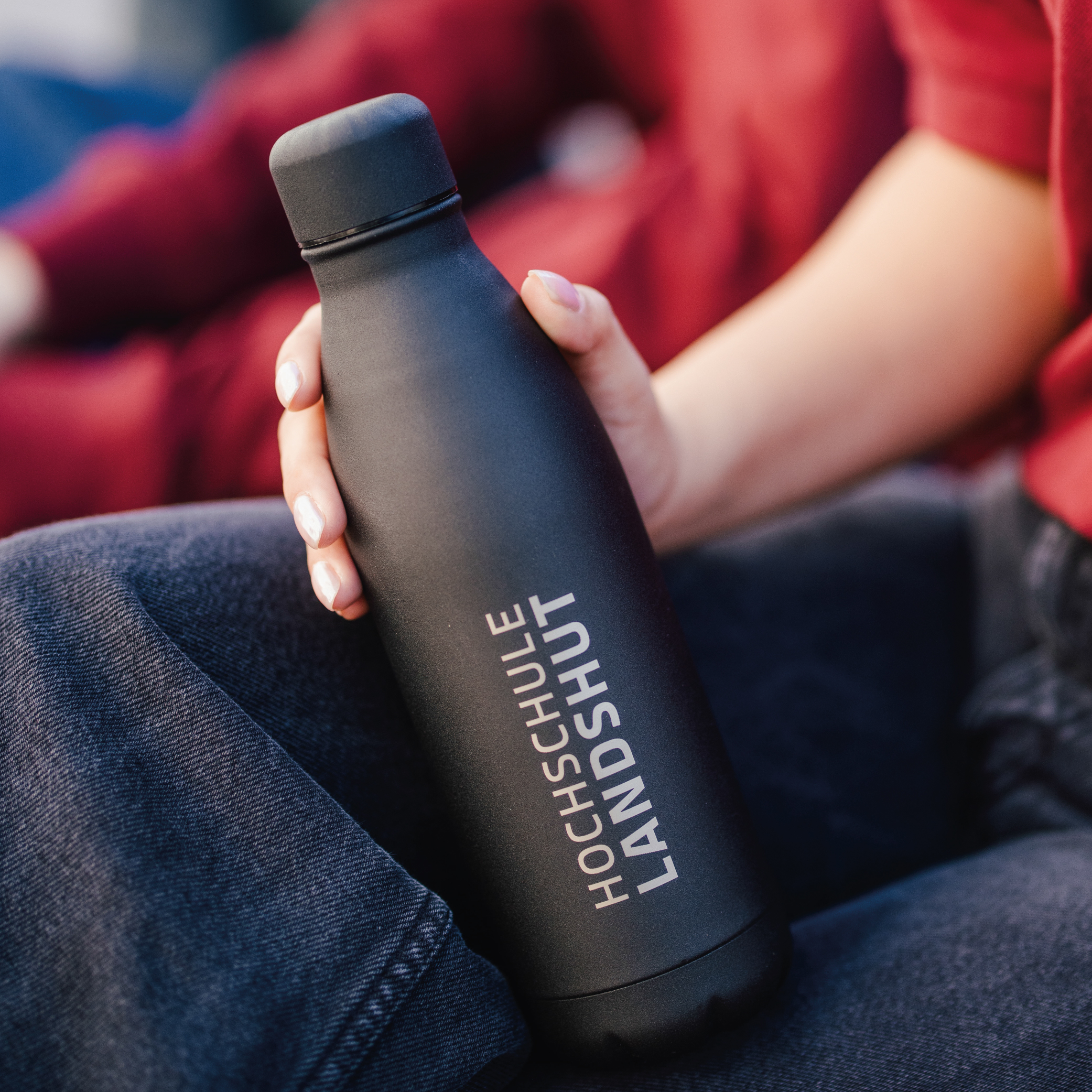 Doppelwandige, auslaufsichere Wasser-/Thermosflasche aus recyceltem Edelstahl. Das trendige, matte Finish verleiht dieser Flasche ein markantes Erscheinungsbild. Mit Schraubdeckel in derselben Farbe. Fassungsvermögen 500 ml. Lasergravur auf der Vorderseite.